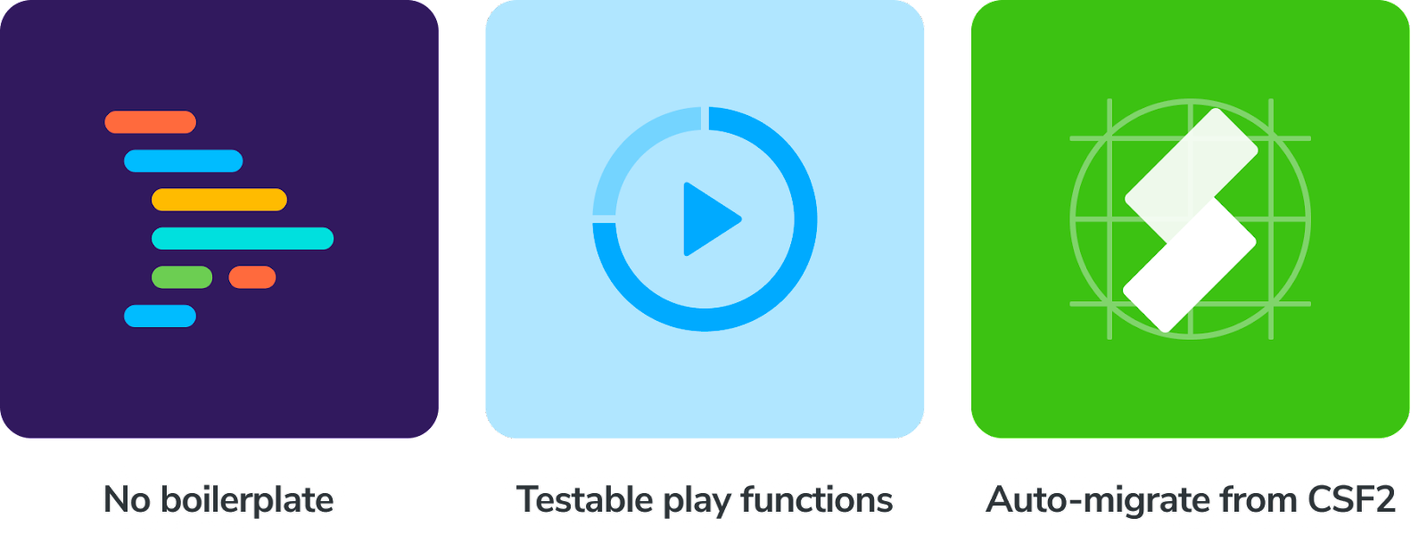 Component Story Format (CSF) helps you develop, test, and document your components in isolation. With CSF3 comes improved ergonomics to help you write more stories with less effort.