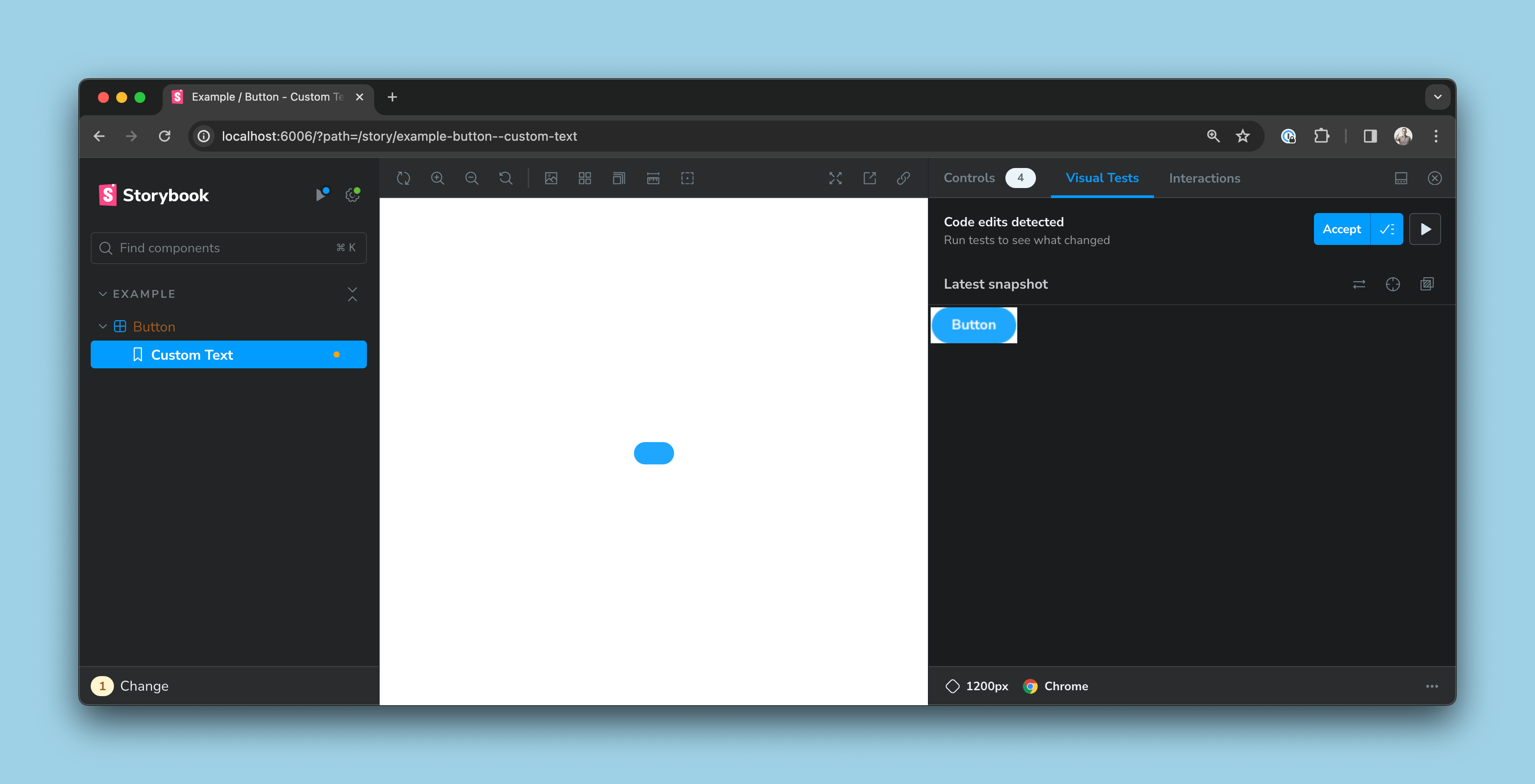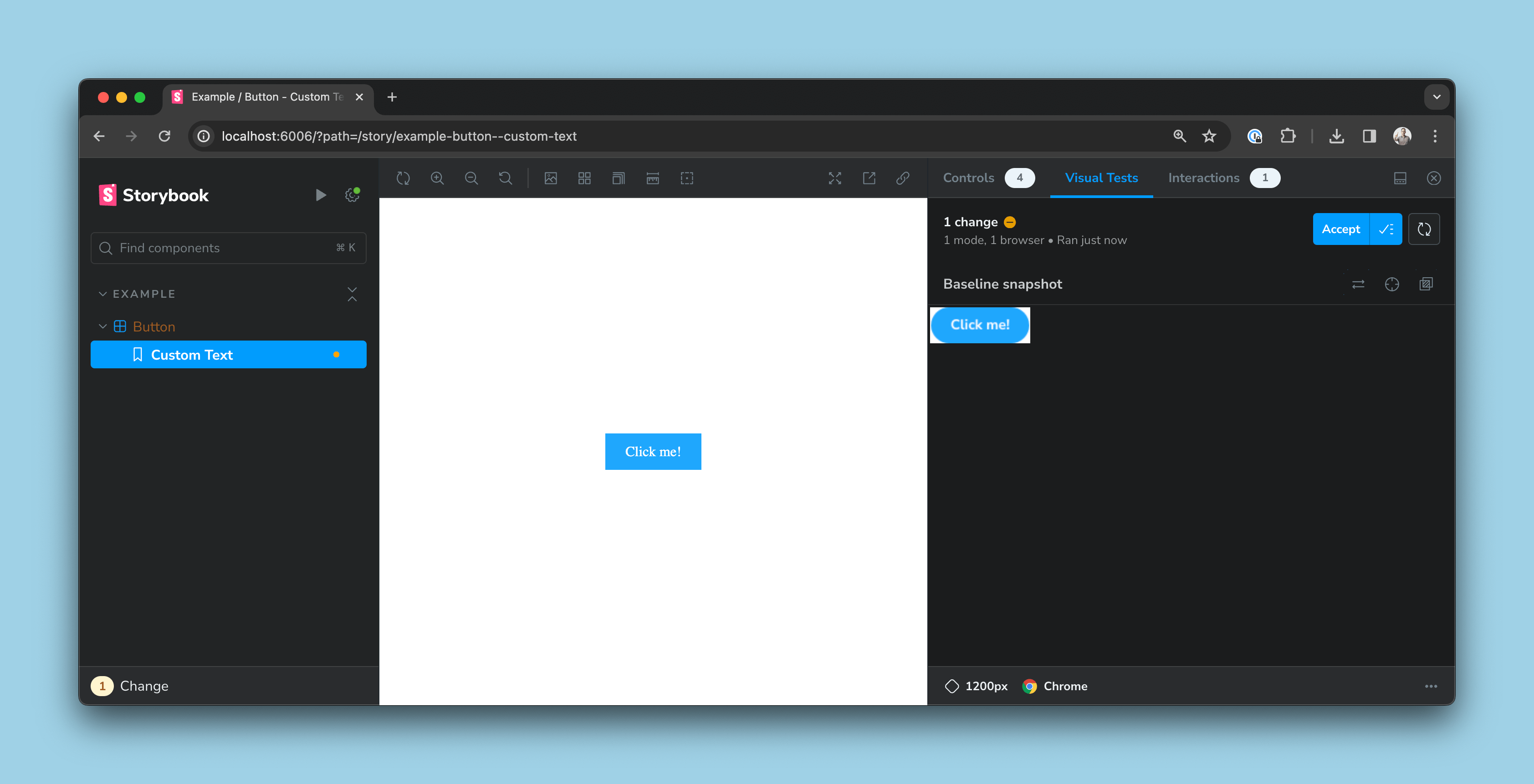 When we use the Visual Tests addon, the addon automatically scans through all stories to pick up visual changes for us. As you can see below, the addon has found a change in the Custom Text story, denoted by ‘1 change’ in the lower left corner and the orange status dot (🟠) in the sidebar indicating that this story has changed. When I review the visual change by opening the Visual Tests addon panel, I realize I’ve introduced a bug: I can see the previously accepted snapshot containing the expected text.